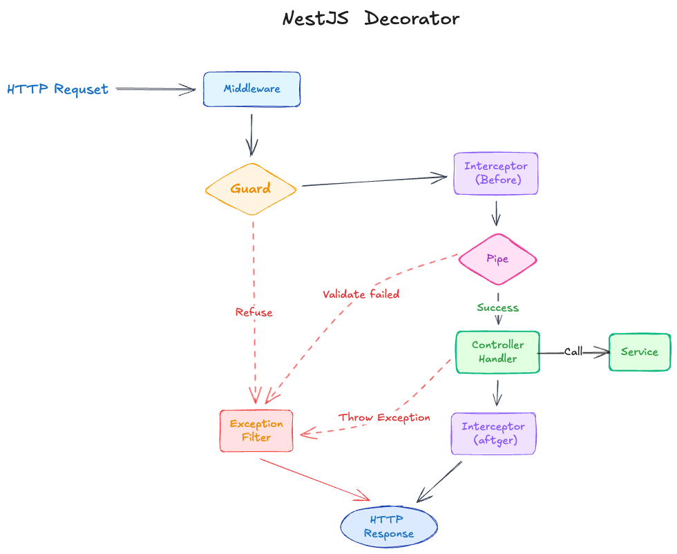 一个 HTTP 请求进入 NestJS 后,会经历一串装饰器的处理:Middleware → Guard → Interceptor (Before) → Pipe → Handler → Interceptor (After) → Exception Filter。这些装饰器像流水线,每个环节负责不同的职责。这篇文章我梳理了这些装饰器的流程以及如何协同工作。